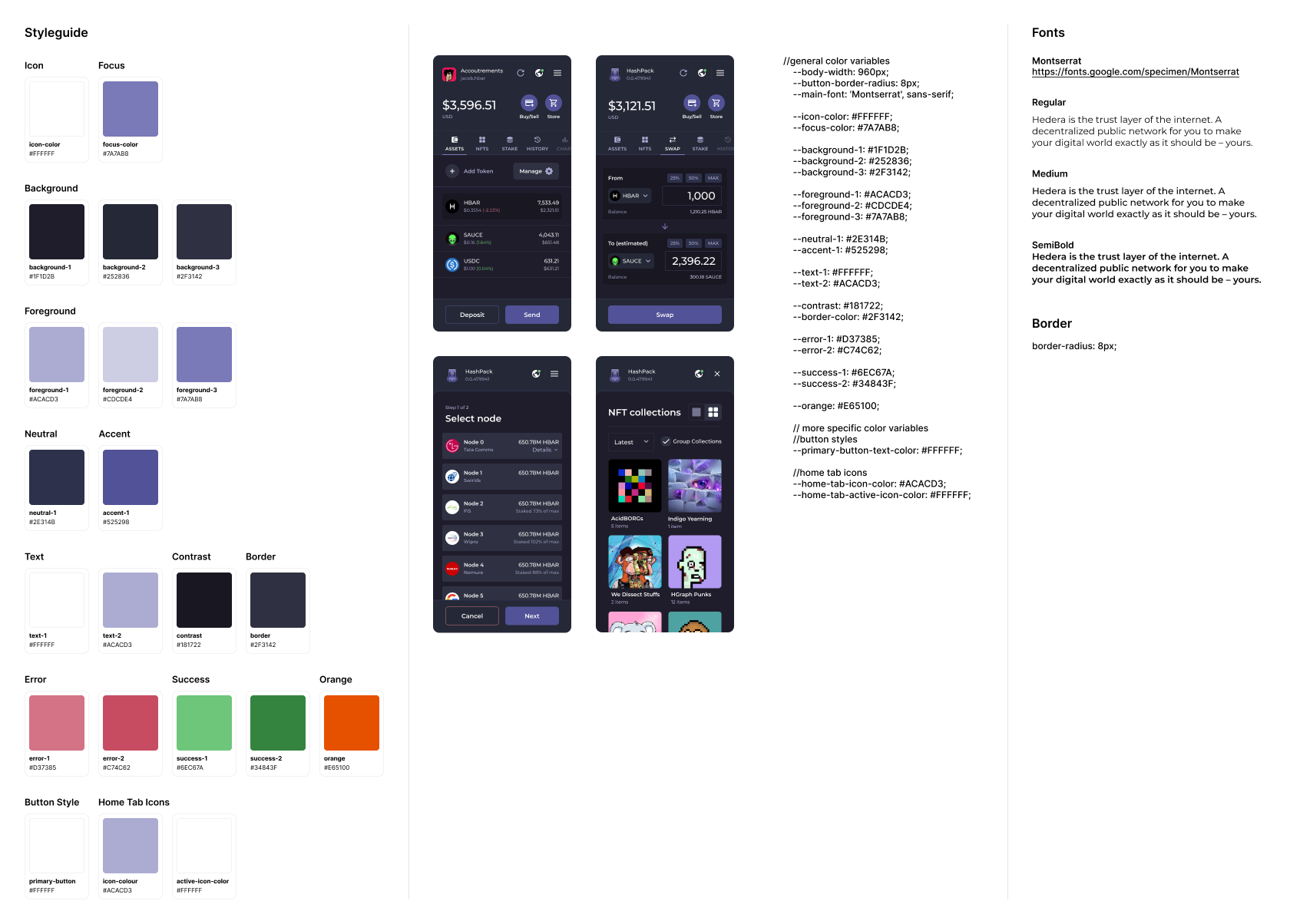 At its core, the HashPack design system is based on the principles of Atomic Design by Brad Frost. We built a modular foundation using reusable patterns, a swatch library and clear styling configurations. With this system we can swap any visual element with ease while keeping the underlying UI consistent and trustworthy.